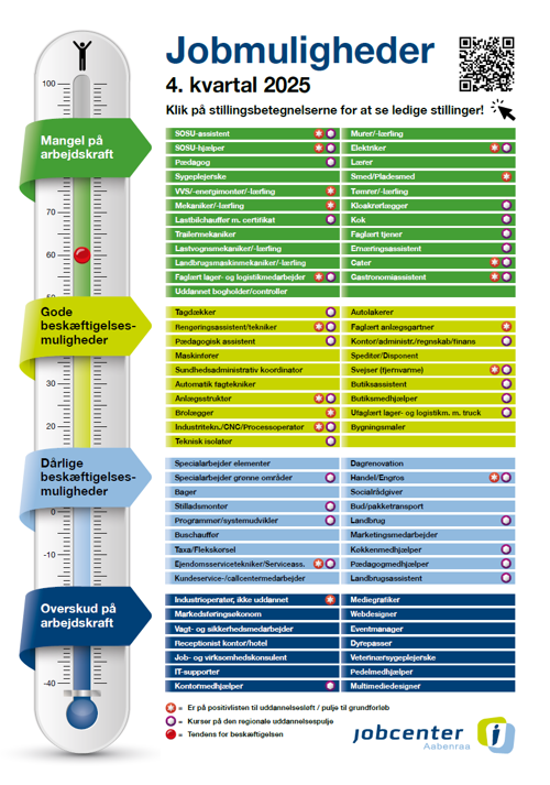 Jobbarometeret er delt op i: mangel på arbejdskraft, gode beskæftigelsesmuligheder, dårlige beskæftigelsesmuligheder og overskud på arbejdskraft. Under de enkelte kategorier kan du se stillingsbetegnelser/arbejdsområder som vi som jobcenter vejleder vores ledige i at søge hen eller undgå. Du kan også se hvilke uddannelses- og opkvalificeringsordninger der er på området